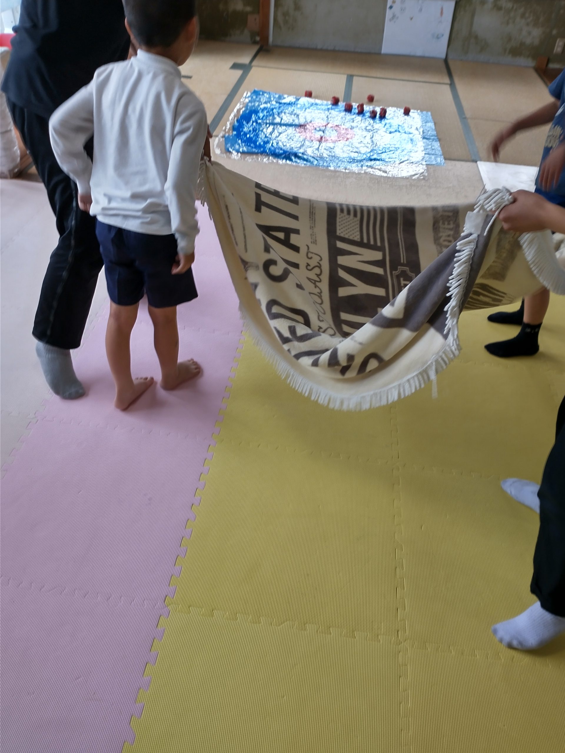 丸い毛布に お手玉(8個)をのせて