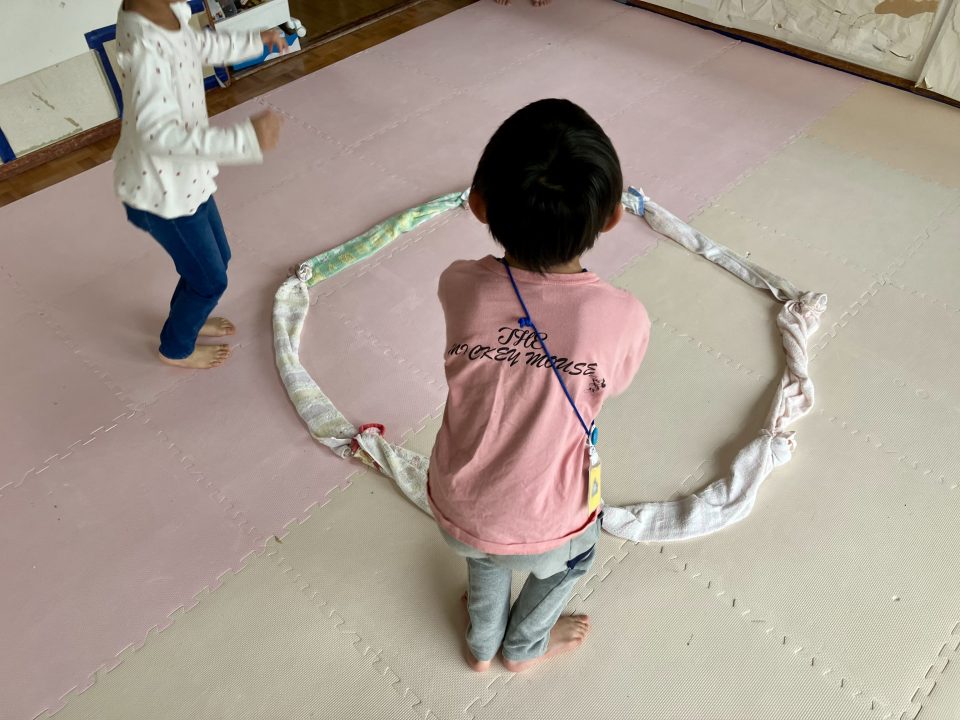 繋いで円にしたタオルの中と外を行き来するゲームです!