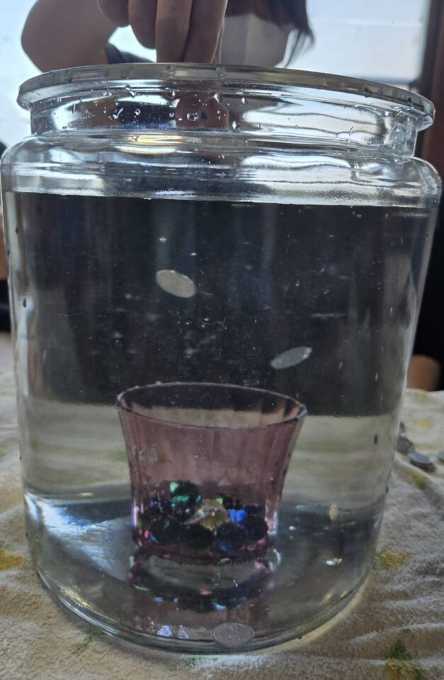 大きな水瓶に水をたっぷり入れて その中に小さなガラスのコップをIN!