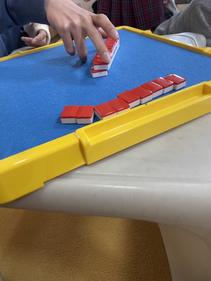ドンジャラのパイを2列作り、一気に1列を上に持ち上げて重ねます。
