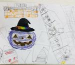 紙に描かれたおばけや魔女などのイラストに色を付けていきました。