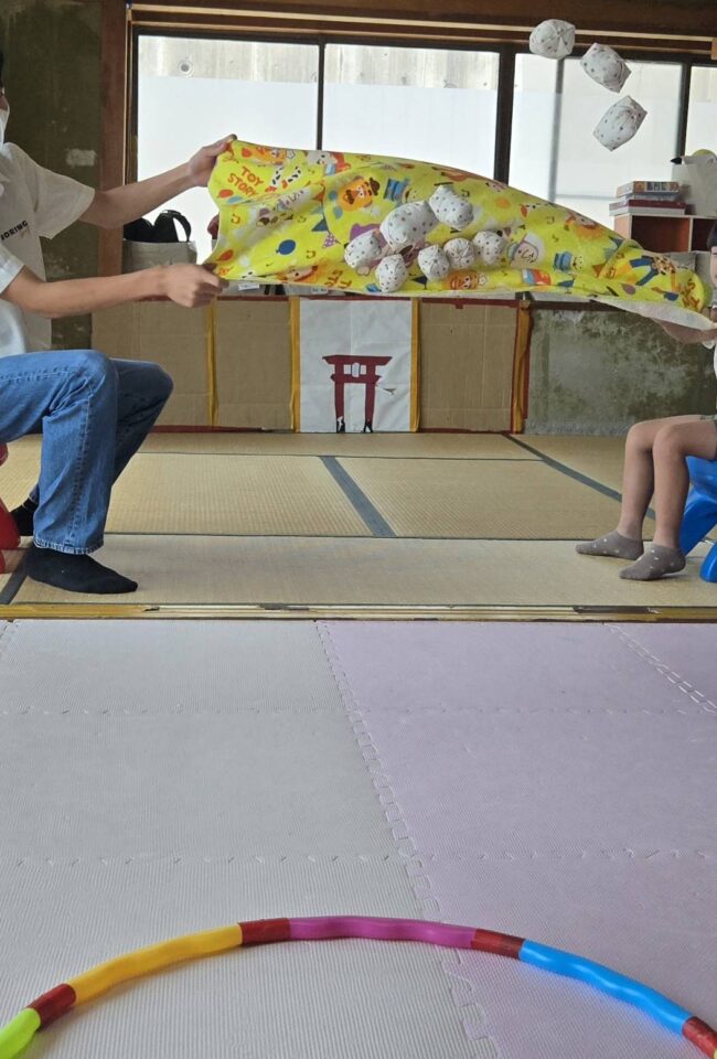 2人で バスタオルを持って バスタオルの上にのっている お手玉10個を 離れた場所にあるフープめがけてポーンと飛ばします!