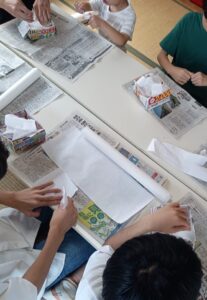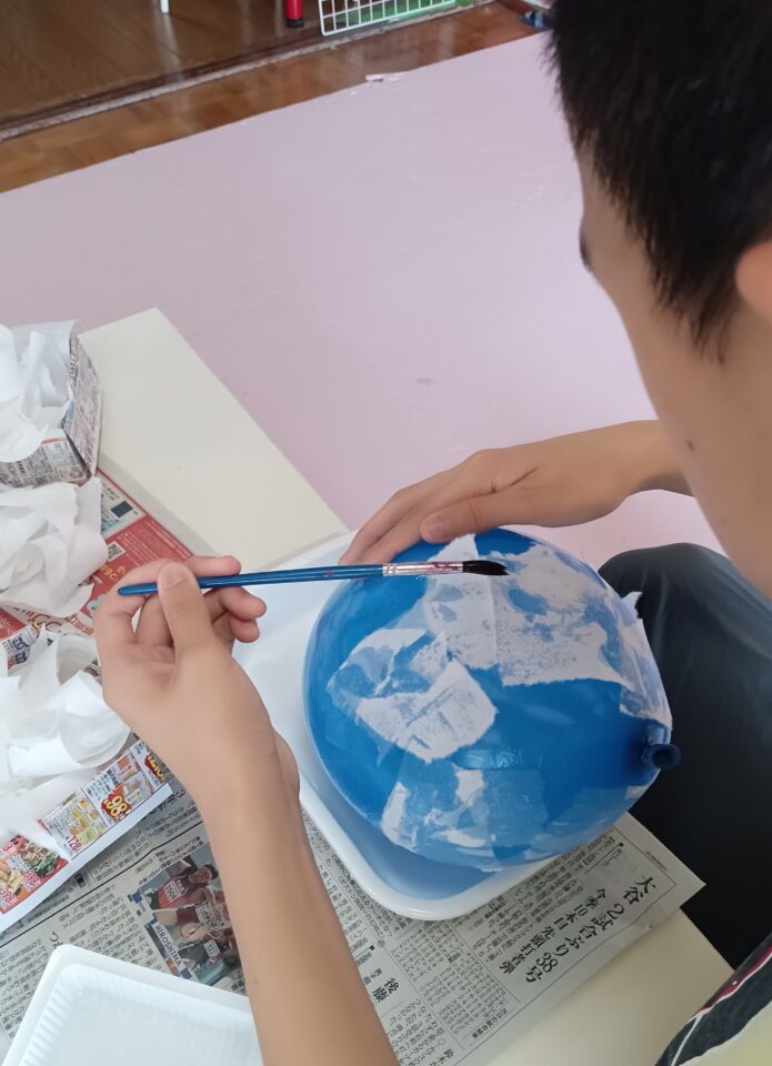 ビリビリの障子紙を 風船に貼っていきます。