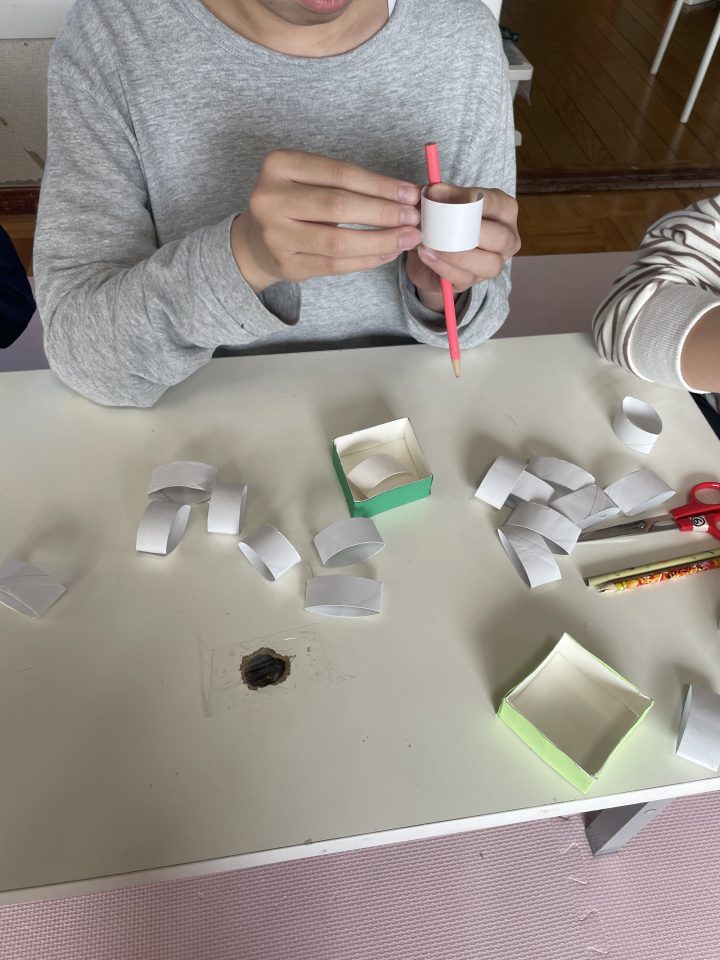 輪切りにしたペーパー芯を鉛筆で巻いたりして形を作り、枠の中に入れて行きます。