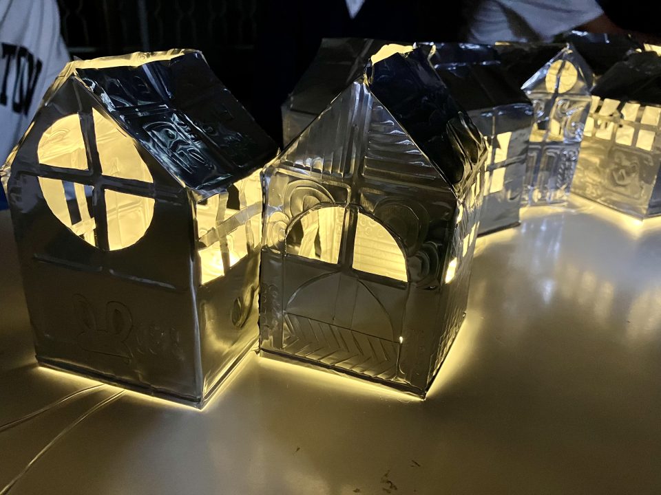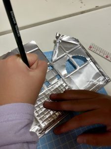 お家の形に切ってあるアルミシートに鉛筆でみんな好きな模様を描いていきました♫