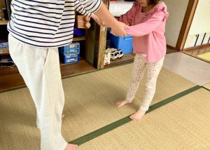 手を繋いでスクワットしたり、