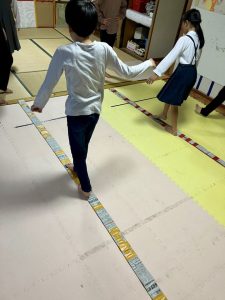 長〜くつないだ新聞紙を平均台のようにまずは渡ってバランスゲーム!
