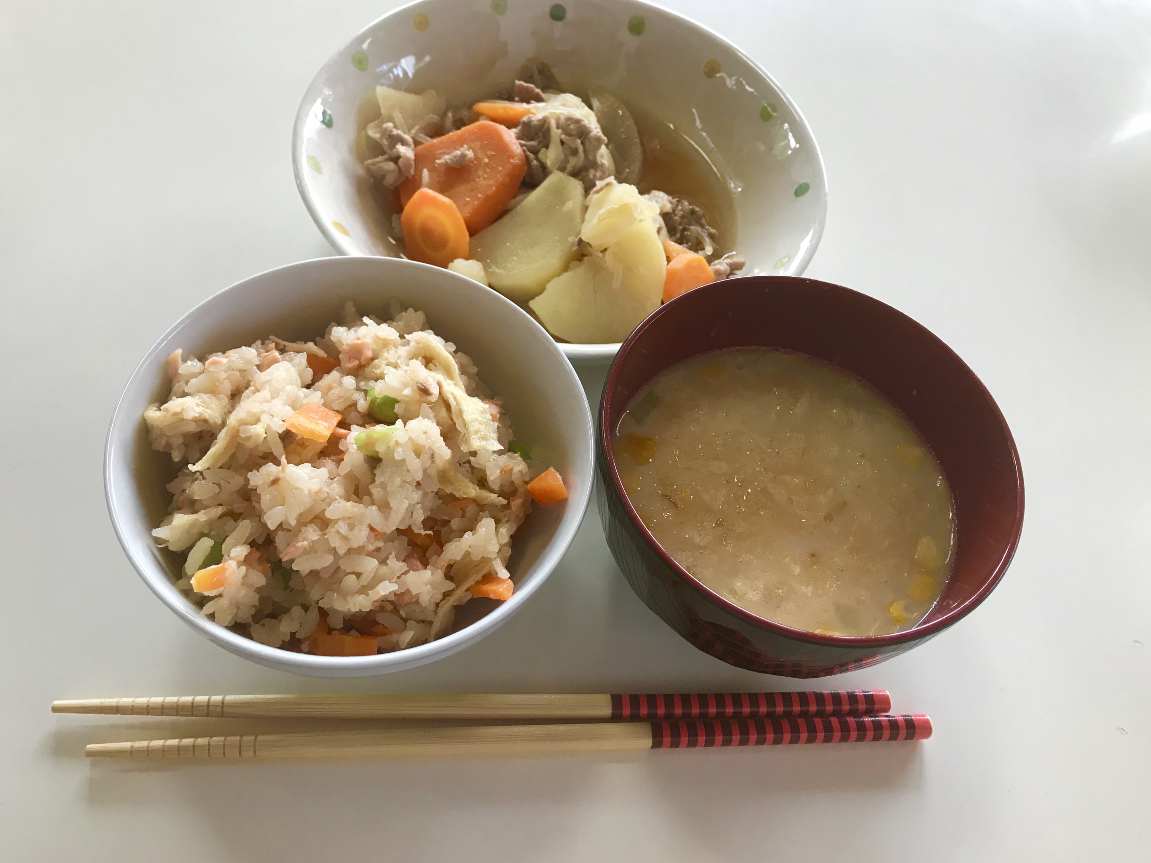 今回の献立は、炊き込みごはん、肉じゃが、コーンスープに決定♪