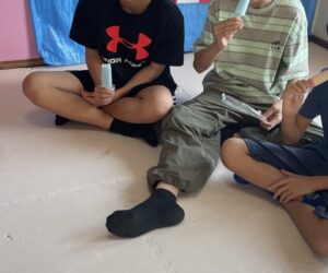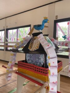 いつも静かな課題室は、みんなで作った手作り提灯や塗り絵、輪っか等で屋台風に。