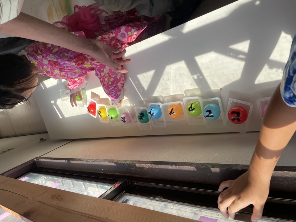 ボールプールから字の書いてあるボールを見つけて何秒で文字に並べられるか?を計測します。
