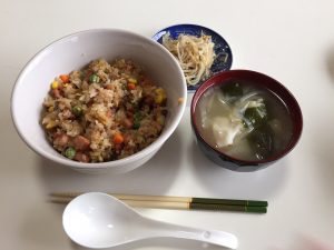 今日の献立は、”チャーハン・餃子スープ・もやしナムル”です。