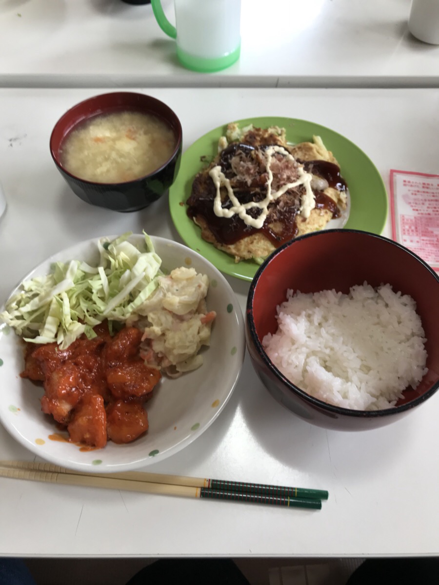 「白ご飯・キャベツ焼き・エビマヨ・ポテトサラダ・中華スープ」