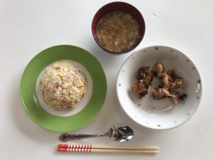 今日のメニューは”パラパラ黄金チャーハン・ネギ塩タレチキン・かき玉汁・アイス”です。