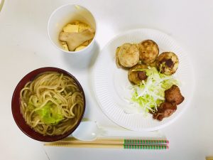 今日の献立は煮込みラーメン、唐揚げ、たこ焼き、茶碗蒸しという