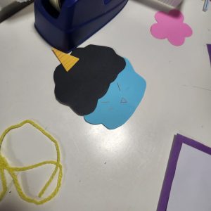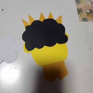 鬼の顔に切った画用紙に今回は画用紙で作った髪の系を付けて好きなお顔にしていきます