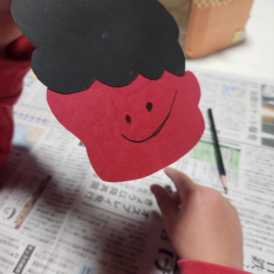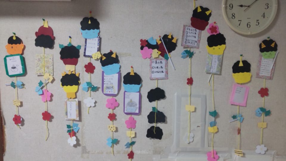 その後紐を顔につけて、鬼のパンツや花などの装飾を貼り付けていき自分の追い出したい鬼を別紙に書いてデコレーションしたら完成👌