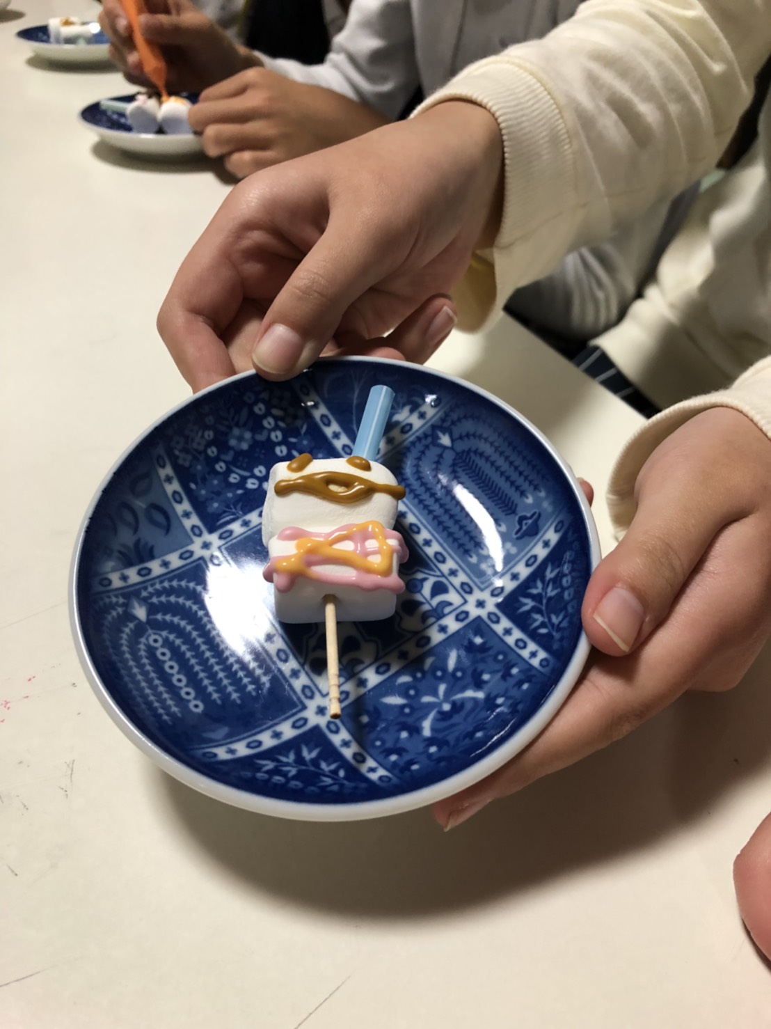 カラフルなチョコペンで表情やボディの細部を丁寧に書いてもらったあとは、小さく切ったストローの帽子を被せて完成です♪(´ε` )