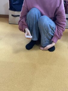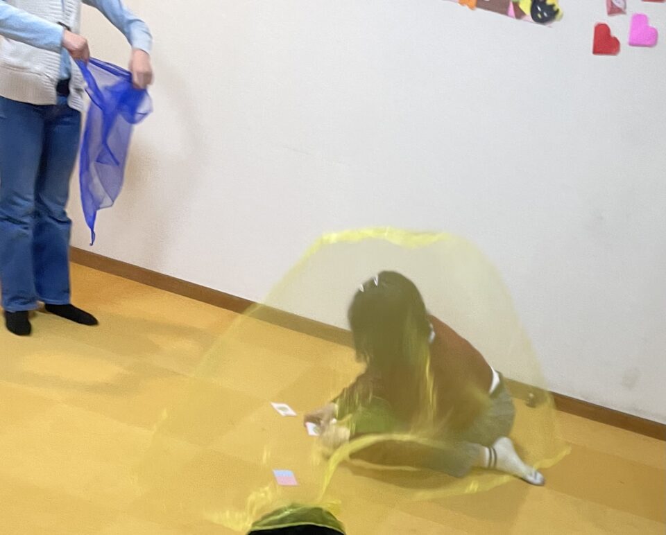 シフォン布は友達と息を合わせて布を投げて掴んだり、上に投げてる間に床にあるカードを表向きにしてキャッチしたり…。