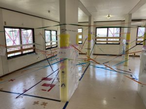PLATZ古江の2階が蜘蛛の巣のようにいっぱいテープが貼られています。
