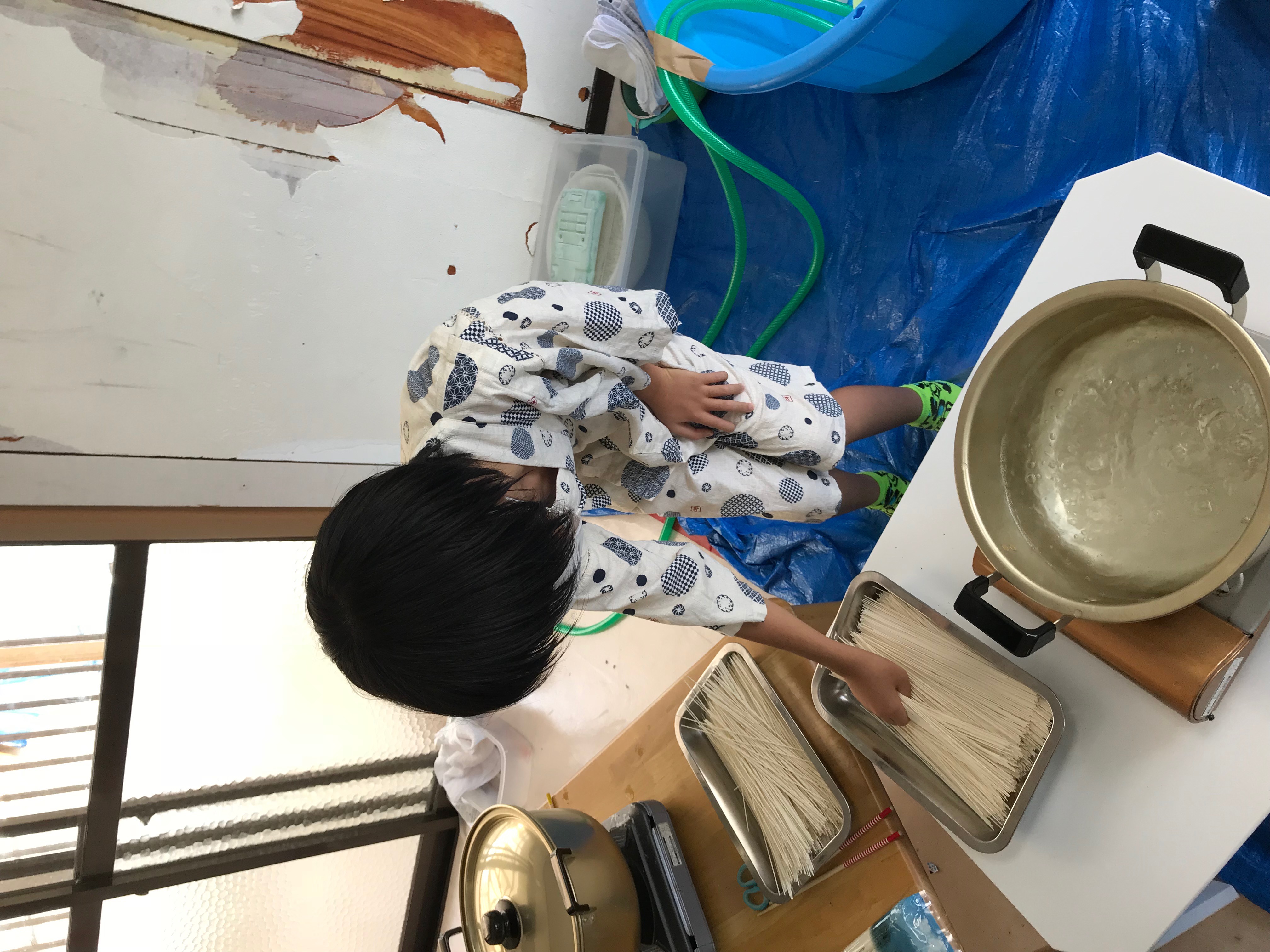 写真の男の子は最後の最後までそうめんを湯がく火の番をして